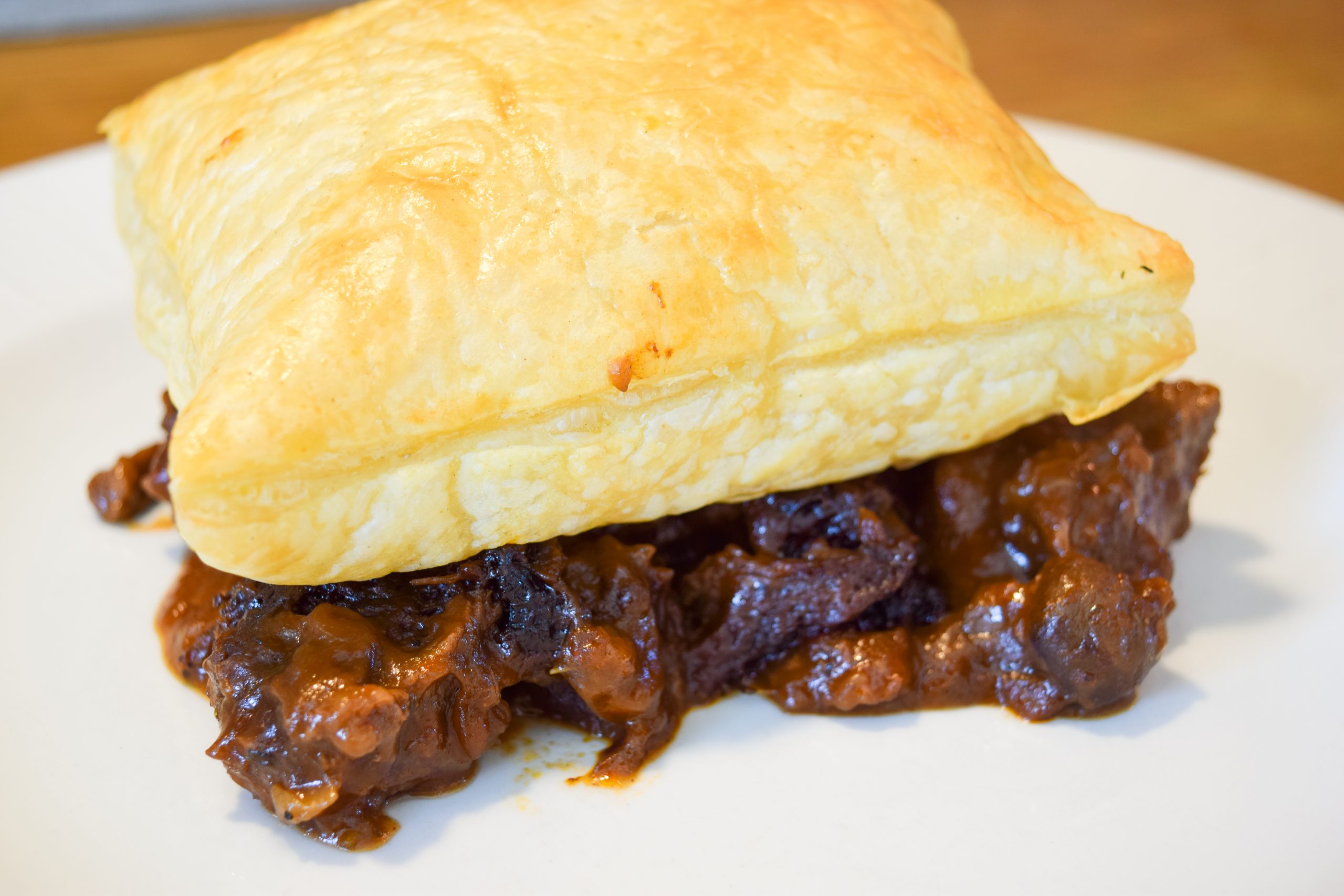 Beef, onion, mushroom, beer (barley, wheat), garlic, thyme, veal jus, celery, tapioca starch, tomato, sugar, sunflower oil, puff pastry (wheat), egg