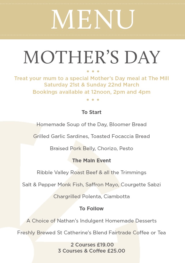 Our chefs have devised a fabulous menu for Mother’s Day weekend at The Mill.